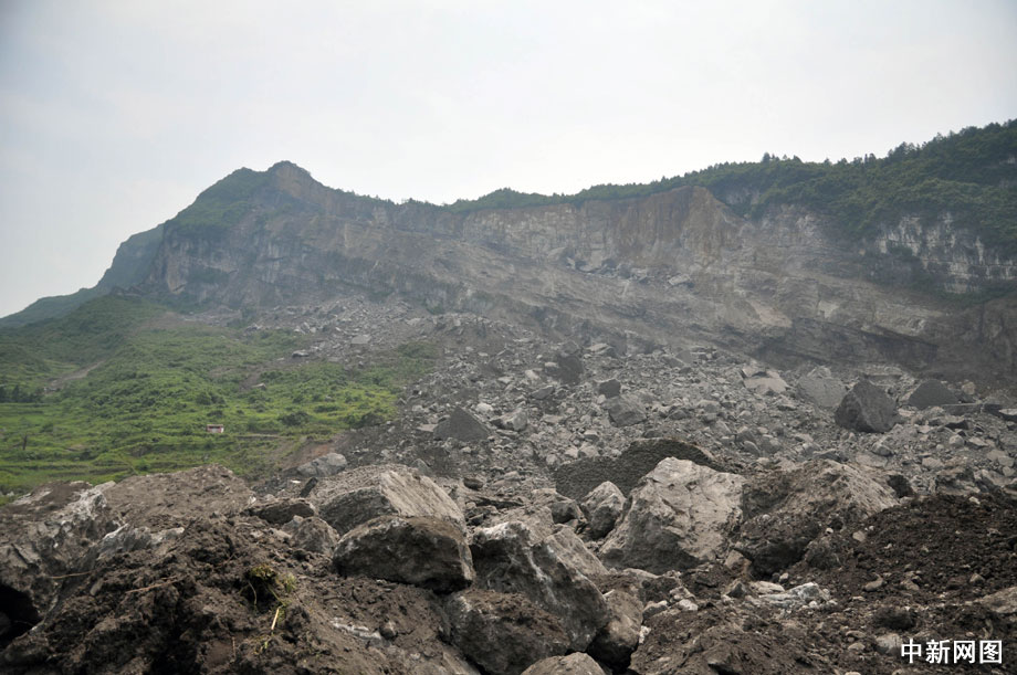 600多米長的巨大滑坡體如洪流一般吞沒了整個山谷。谷下,有著十幾戶家人居住,還有一個正在采礦的鐵礦場。 曹多然 攝