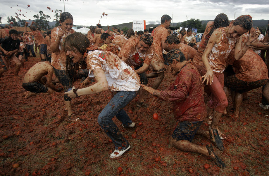 2009年6月14日,哥倫比亞第五屆番茄狂歡節(jié)開(kāi)幕,參與者互相投擲西紅柿,盡情狂歡慶豐收。來(lái)自哥倫比亞各地的狂歡者們?cè)萍谑锥疾ǜ绱髺|北部的蘇塔馬錢小鎮(zhèn),街道上立刻變成了西紅柿紛飛的戰(zhàn)場(chǎng)。雖然每個(gè)人的臉上身上沾滿了西紅柿汁,但人們還是樂(lè)此不疲又是丟又是砸,把成堆的西紅柿當(dāng)成打仗的“武器”。還有人特地穿上白衣白褲,身上越紅,心里就越痛快。