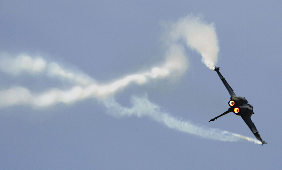 圖為法國陣風(fēng)戰(zhàn)斗機進(jìn)行飛行表演。
