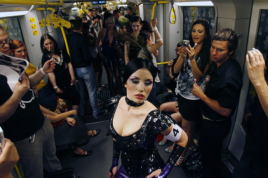 7月2日,模特在德國(guó)首都柏林的一輛地鐵上,演繹名為“地鐵上的貓步”時(shí)裝秀。