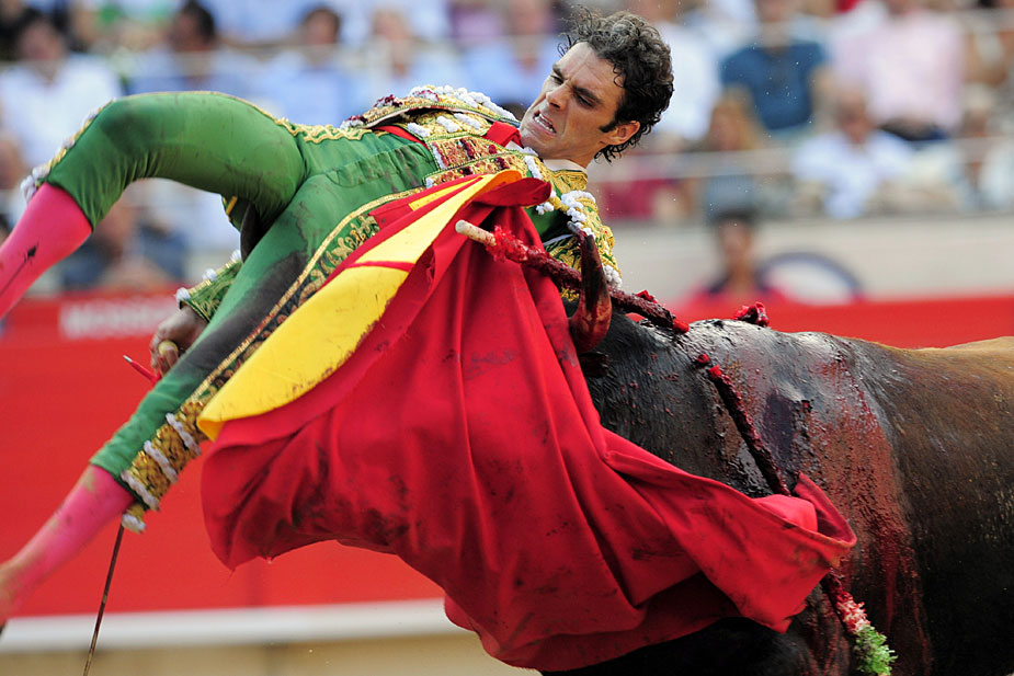 7月5日,西班牙巴塞羅那舉行了一場驚險的斗牛比賽,一位斗牛士在與牛較量時被牛頂起,所幸該人“武功”高強未造成大的傷害。
