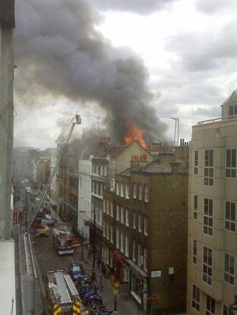 英國倫敦中部蘇豪區(qū)在當?shù)貢r間10日下午2時左右發(fā)生火警,起火的5層高商業(yè)樓宇被嚴重焚毀,現(xiàn)場冒出大量濃煙,在倫敦市內多處均清楚可見。消防部門派出12輛消防車及60名消防員進行灌救。