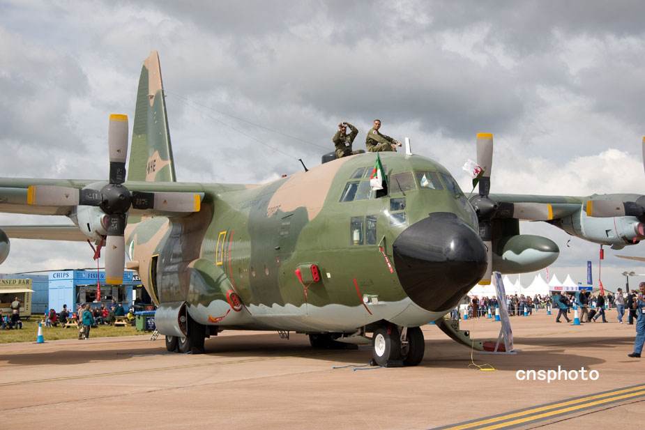 2009年7月,“2009英國(guó)費(fèi)爾福德航展”在英格蘭費(fèi)爾福德開(kāi)展。圖為在英國(guó)費(fèi)爾福德航展作靜態(tài)展示的阿爾及利亞空軍C-130H運(yùn)輸機(jī)。中新社發(fā) 潘禹 攝