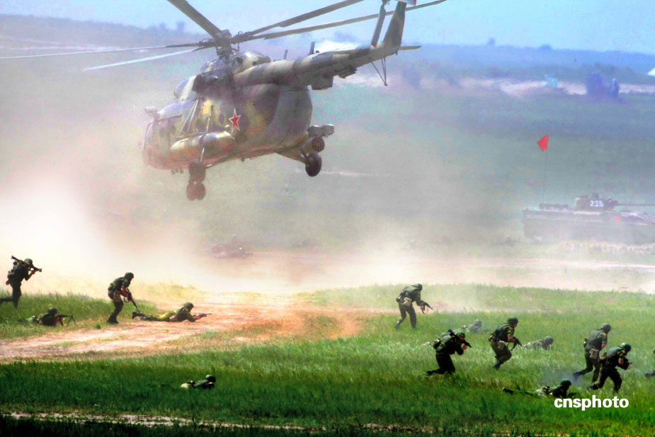 中國(guó)、俄羅斯兩軍總參謀長(zhǎng),7月23日上午到沈陽(yáng)軍區(qū)洮南合同戰(zhàn)術(shù)訓(xùn)練基地,觀看“和平使命2009”聯(lián)合反恐軍事演習(xí)。雙方以陸軍和空軍為主,中方參演部隊(duì)包括1個(gè)陸軍戰(zhàn)斗群和1個(gè)空軍戰(zhàn)斗群。俄方參演兵力包括1個(gè)陸軍加強(qiáng)摩步營(yíng)、1個(gè)空降突擊連和部分空軍兵力,雙方投入兵力兩千多人。中新社發(fā) 宋吉河 攝