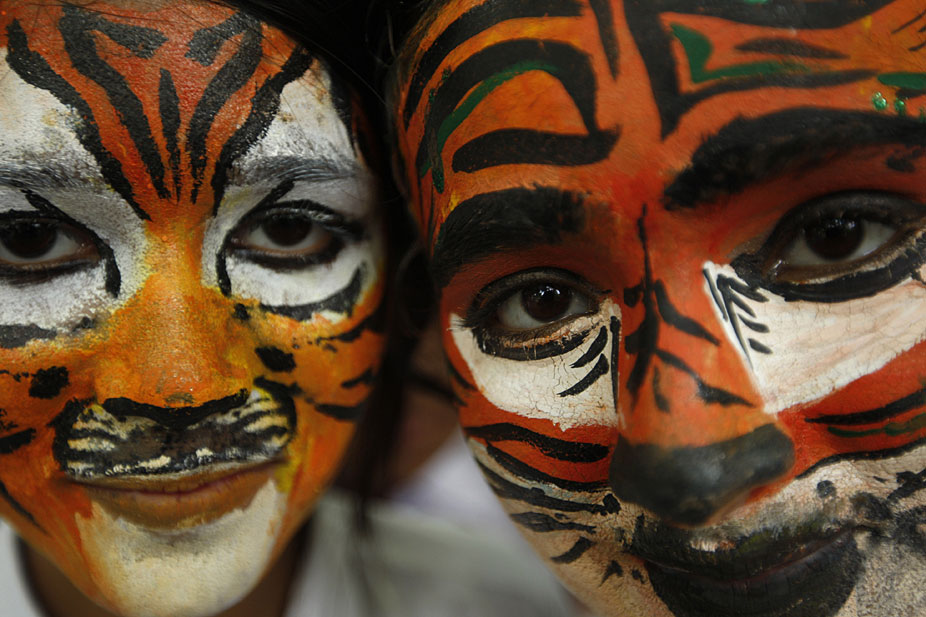 7月28日,約2000名學生在新德里化妝成老虎的臉譜,圍坐成老虎的造型,與官員和野生動物專家們一起呼吁人們保護孟加拉虎和其他野生動物。