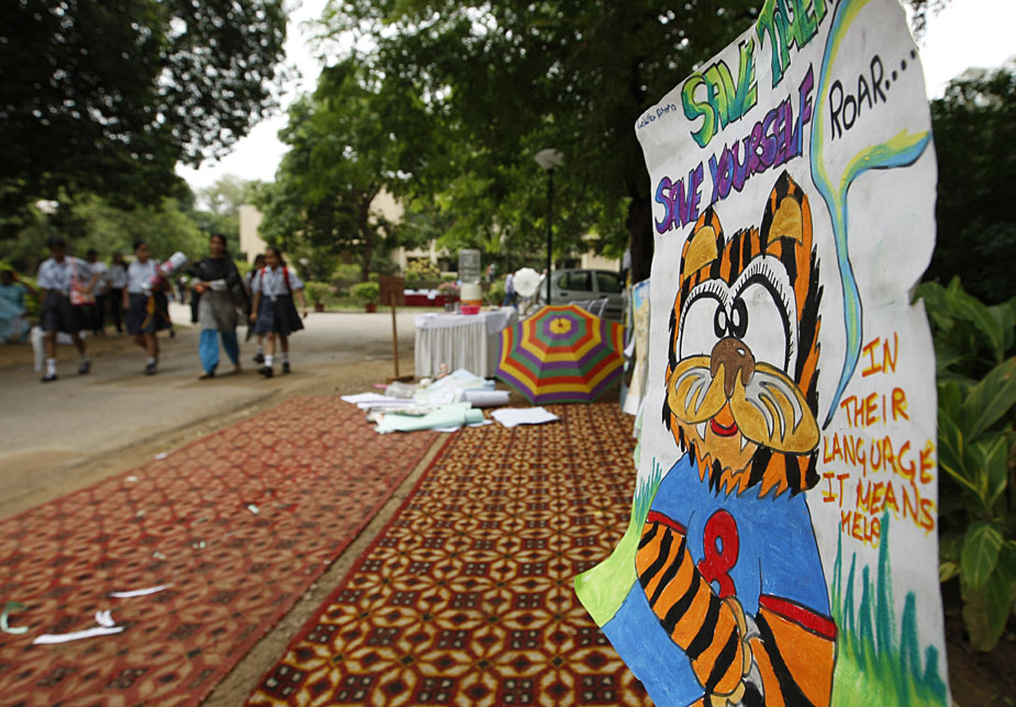 7月28日,約2000名學(xué)生在新德里化妝成老虎的臉譜,圍坐成老虎的造型,與官員和野生動(dòng)物專家們一起呼吁人們保護(hù)孟加拉虎和其他野生動(dòng)物。