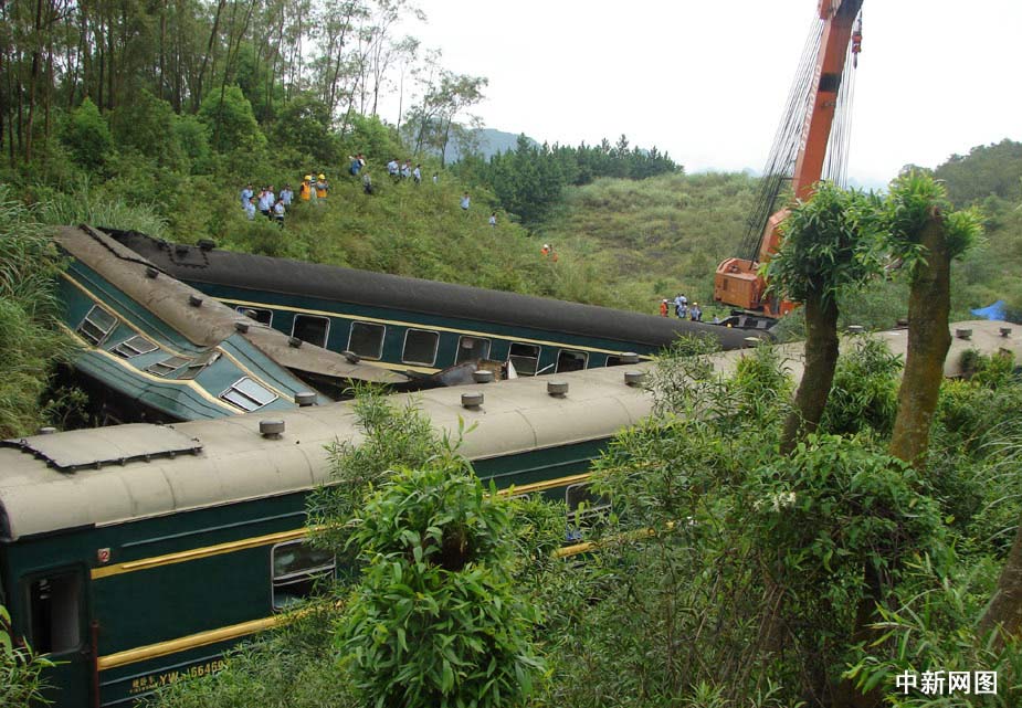2009年7月29日4時(shí)22分,由襄樊開往湛江的1473次旅客列車運(yùn)行至焦柳線廣西境內(nèi)古砦至寨隆間,因連日持續(xù)強(qiáng)降雨造成山體崩塌掩埋線路,列車機(jī)車及機(jī)后1-4位車輛脫軌,造成4名旅客死亡,50余名旅客受傷,焦柳線中斷行車。廖承果 攝
