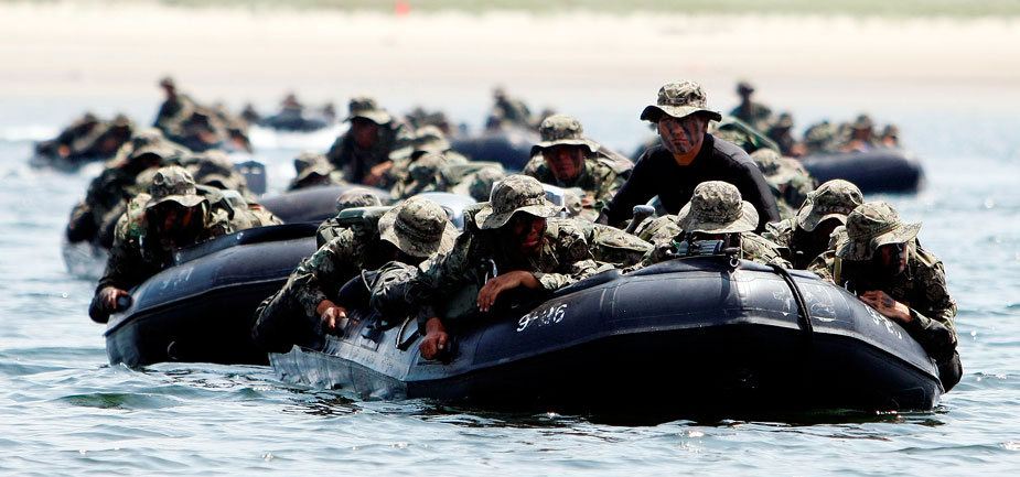 2009年8月5日,韓國(guó)特種戰(zhàn)司令部特種作戰(zhàn)分隊(duì)在南泰安郡演練海上滲透攻擊。