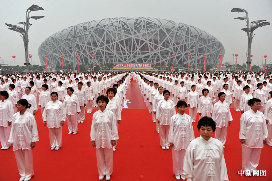 8月8日,全國首個(gè)“全民健身日”北京主會(huì)場啟動(dòng)儀式上,三萬多群眾進(jìn)行太極拳展示活動(dòng),在世界吉尼斯總部認(rèn)證官員的見證下成功打破世界紀(jì)錄。中新網(wǎng)記者 金碩 攝
