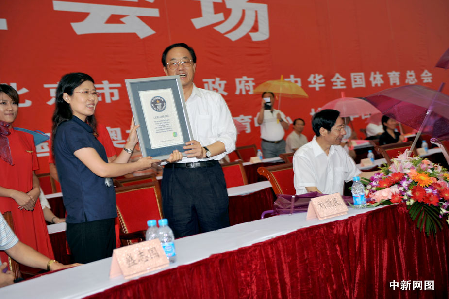 圖為世界吉尼斯總部認(rèn)證官將認(rèn)證書頒發(fā)給北京市副市長(zhǎng)劉敬民。