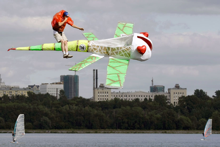 8月9日,莫斯科河畔舉辦一年一度的“墜落節(jié)”,表演者帶著自己設(shè)計制作的各種“飛行器”勇敢的從高空跳入水中。