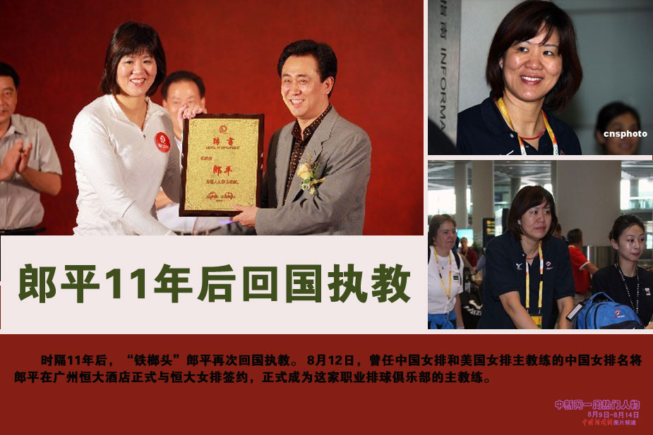 中新網(wǎng)本周熱點人物之郎平——曾任中國女排和美國女排主教練的中國女排名將郎平8月12日在廣州恒大酒店正式與恒大女排簽約,正式成為這家職業(yè)排球俱樂部的主教練。這標(biāo)志著時隔11年,郎平再次回國執(zhí)教。