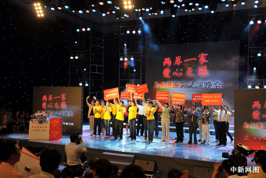8月22日晚,北京舉行“兩岸一家 愛心無限”為臺灣同胞賑災(zāi)義演晚會,大陸和臺灣演藝界明星登臺為臺灣災(zāi)區(qū)同胞共獻(xiàn)愛心,晚會臨近結(jié)束時(shí)共收到各界捐款3000多萬元。中新網(wǎng)記者 金碩 攝