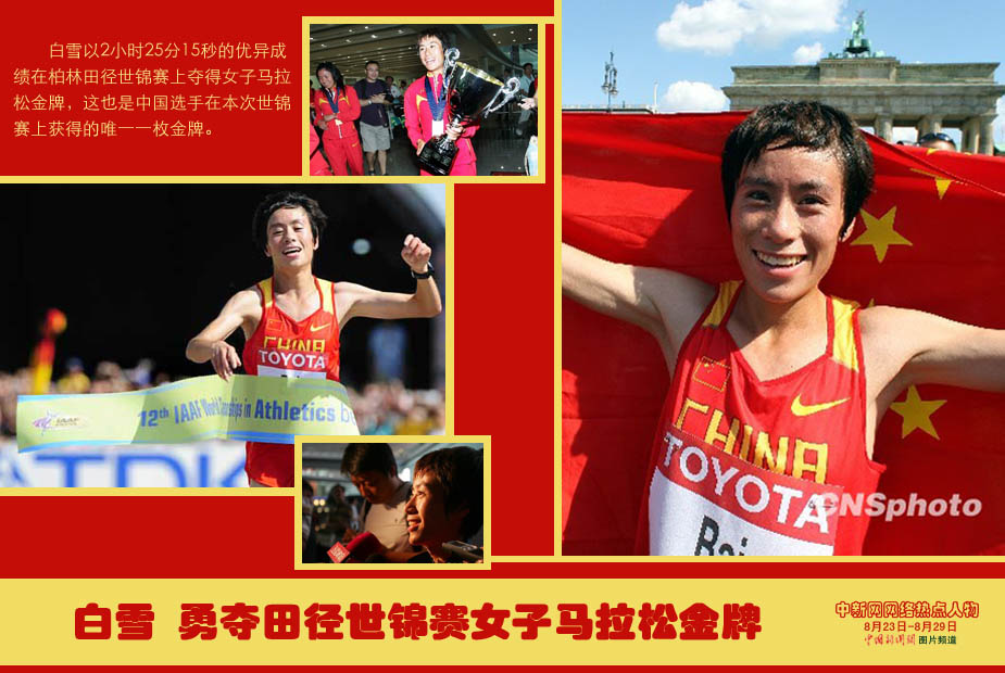 中新網(wǎng)本周熱點人物之——白雪 白雪以2小時25分15秒的優(yōu)異成績在柏林田徑世錦賽上奪得女子馬拉松金牌,這也是中國選手在本次世錦賽上獲得的唯一一枚金牌。
