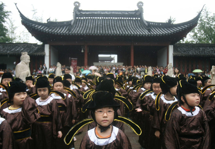 2009年8月31日,南京夫子廟小學一年級新生在南京夫子廟參加了“開筆破蒙”儀式。點朱砂、寫“人”字、念《論語》……接受傳統(tǒng)文化熏陶成為孩子們新學期的第一課。一年級新生穿著統(tǒng)一的“祭孔服”,老師們挨個在孩子們額頭點上朱砂痣,并送上祝福的話。點朱砂,又稱“開天眼”,寓意孩子從此眼明心明,好讀書,讀好書。麥兜/CFP