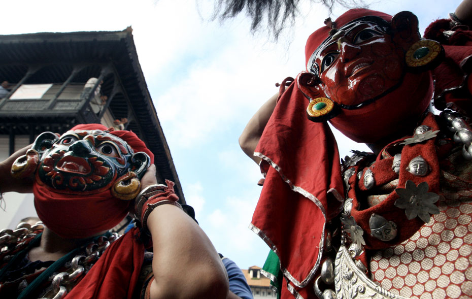 圖為節(jié)日當(dāng)天人們戴上傳統(tǒng)的尼泊爾面具載歌載舞。