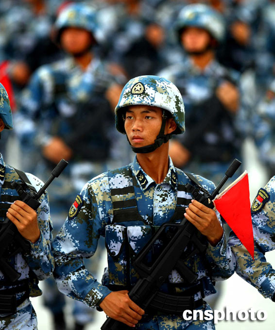 9月3日,解放軍官兵在位于北京郊區(qū)的一處徒步方隊閱兵村內訓練。今年國慶節(jié)將舉行新中國成立60周年國慶首都盛大閱兵儀式。中新社發(fā) 宋吉河 攝