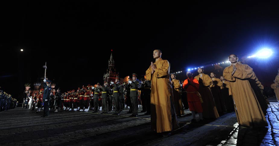 9月4日晚,在俄羅斯莫斯科紅場舉行的俄羅斯國際軍樂節(jié)開幕前夕的總彩排上,中國少林武僧亮相并進行了精彩表演。