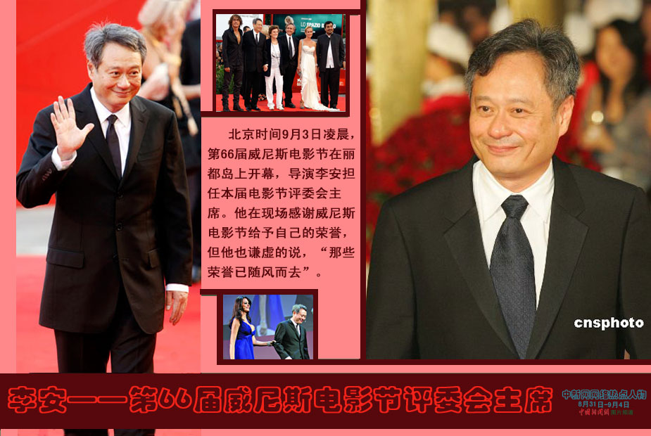 中新網本周熱點人物之——李安 北京時間9月3日凌晨,第66屆威尼斯電影節(jié)在麗都島上開幕,導演李安擔任本屆電影節(jié)評委會主席。他在現場感謝威尼斯電影節(jié)給予自己的榮譽,但他也謙虛的說,“那些榮譽已隨風而去”。來源:中國新聞網、新京報