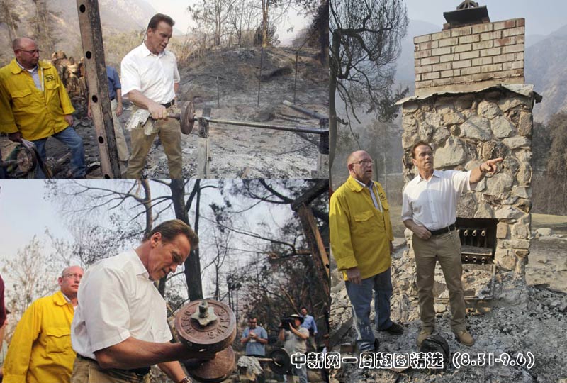當(dāng)?shù)貢r(shí)間9月3日,加州州長(zhǎng)施瓦辛格探訪了洛杉磯市圖洪加附近被火災(zāi)燒毀的地區(qū)。圖片來(lái)源:中國(guó)新聞網(wǎng)