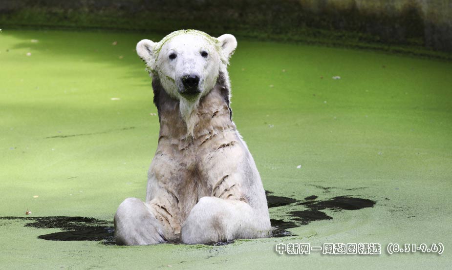 9月4日,德國柏林動物園的明星北極熊克努特正在水中“自娛自樂”。圖片來源:中國新聞網(wǎng)