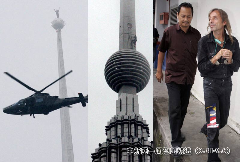 9月1日,現(xiàn)年46歲的法國(guó)“蜘蛛俠” 阿蘭•羅伯特成功爬上了馬來(lái)西亞最高的建筑物——吉隆坡的雙子塔,但隨后被警方逮捕。圖片來(lái)源:中國(guó)新聞網(wǎng)