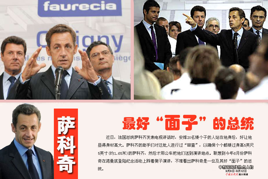 中新網(wǎng)本周熱點(diǎn)人物之——薩科奇 近日,法國總統(tǒng)薩科齊發(fā)表電視講話時,安排20名矮個子的人站在他身后,好讓他顯得身材高大。薩科齊的助手們對這批人進(jìn)行過“審查”,以確保個個都矮過身高5英尺5英寸(約1.65米)的薩科齊,然后才用公車把他們送到演講地點(diǎn)。聯(lián)想到今年6月份薩科奇在諾曼底登陸紀(jì)念活動上踩著凳子演講,不難看出薩科奇是一位及其好“面子”的總統(tǒng)。