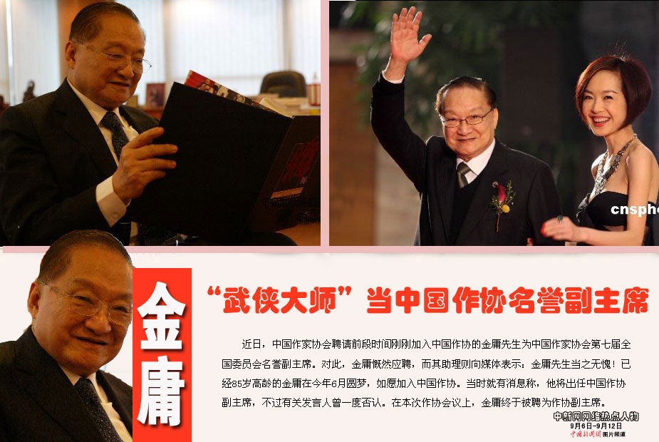 中新網(wǎng)本周熱點(diǎn)人物之——金庸 近日,中國作家協(xié)會(huì)聘請(qǐng)前段時(shí)間剛剛加入中國作協(xié)的金庸先生為中國作家協(xié)會(huì)第七屆全國委員會(huì)名譽(yù)副主席。對(duì)此,金庸慨然應(yīng)聘,而其助理則向媒體表示:金庸先生當(dāng)之無愧!已經(jīng)85歲高齡的金庸在今年6月圓夢,如愿加入中國作協(xié)。當(dāng)時(shí)就有消息稱,他將出任中國作協(xié)副主席,不過有關(guān)發(fā)言人曾一度否認(rèn)。在本次作協(xié)會(huì)議上,金庸終于被聘為作協(xié)副主席。