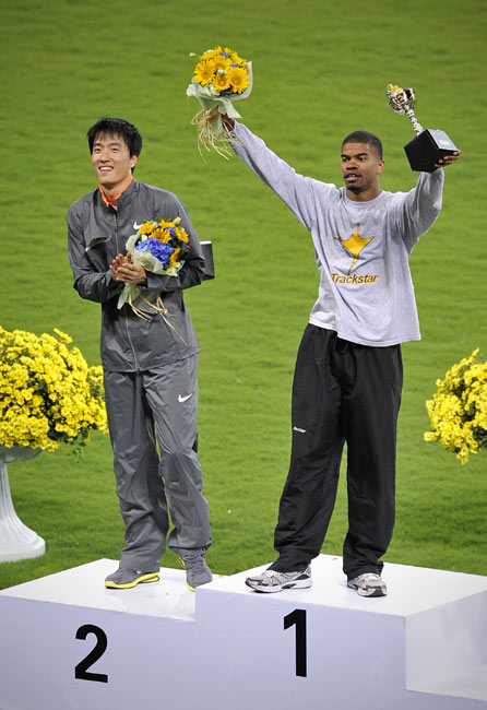 圖為領獎臺的翔飛人。在20日晚進行的上海田徑大獎賽的男子110米欄的比賽中,劉翔時隔13個月后重返賽場,并跑出13秒15的成績。美國名將特拉梅爾以13秒15的同樣成績、近乎為零的優(yōu)勢奪走冠軍。
