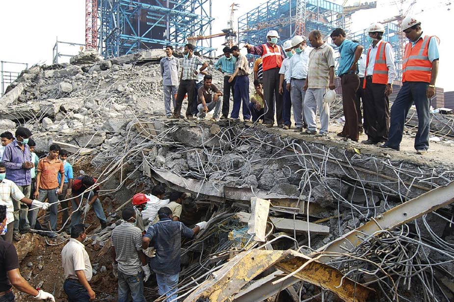 印度中部一座在建電廠的巨型煙囪23日下午發(fā)生倒塌,目前估計(jì)已有至少100人罹難。圖片來源:中國(guó)新聞網(wǎng)