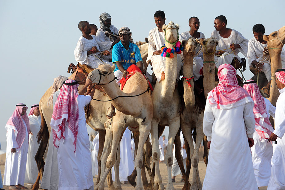 9月25日,在沙特阿拉伯東部的哈利斯,駱駝騎士們騎著自己的座駕在大漠中飛馳。圖片來(lái)源:中國(guó)新聞網(wǎng)