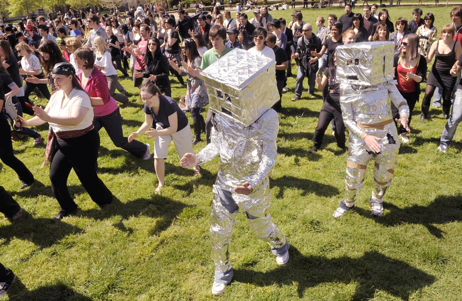 9月29日,379名澳大利亞學(xué)生在草坪上齊刷刷地跳起了“機(jī)器人舞”,打破了集體跳“機(jī)器人舞”的世界紀(jì)錄。其中還有一些學(xué)生從頭到腳裹上了金屬箔紙,還有一些身穿海盜服裝。此前集體跳“機(jī)器人舞”的紀(jì)錄保持者是276名來(lái)自英國(guó)肯特大學(xué)的學(xué)生。