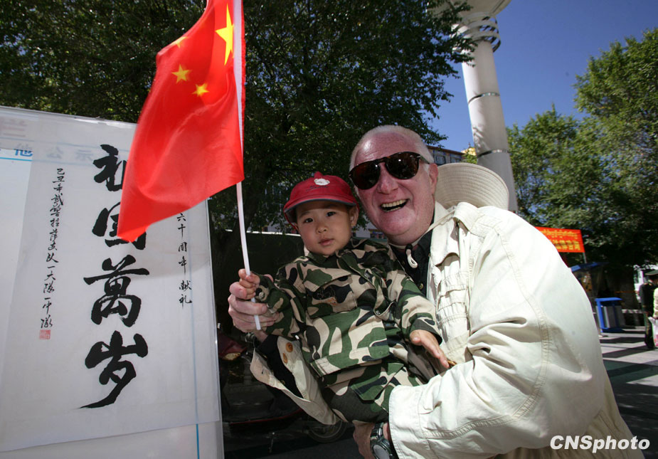 9月27日上午,為迎接國慶60周年,武警西藏總隊官兵為駐地群眾開展擁政愛民、服務(wù)群眾便民活動。一位外國游客抱著中國孩子,在武警官兵的書法作品“祖國萬歲”前,一起搖動五星紅旗,共慶新中國國慶60周年。 中新社發(fā) 錢檬 攝
