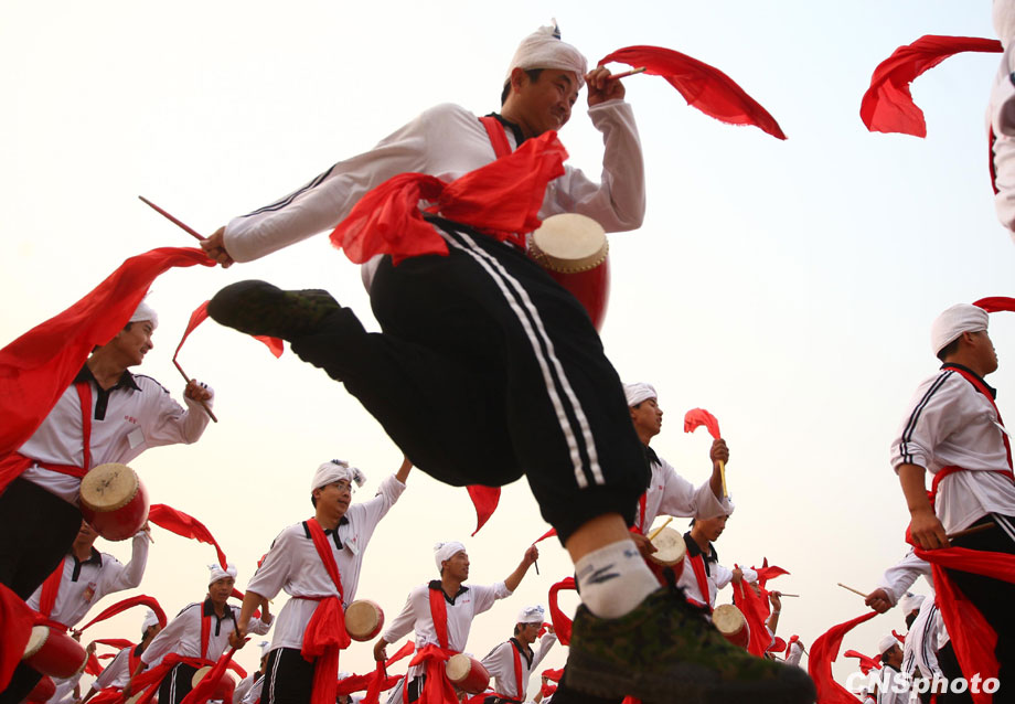 9月16日,千余名來自陜西安塞的腰鼓隊員在北京密云訓(xùn)練基地和其他方陣合練。該方陣隊員全部是來自陜西省延安市安塞縣的農(nóng)民,10月1日他們將走在群眾游行隊伍中,在天安門城樓前舞起安塞腰鼓。該方陣也是群眾游行隊伍中唯一一支京外隊伍,唯一一個全部由農(nóng)民組成的方陣。 中新社發(fā) 杜洋 攝