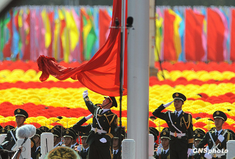 2009年10月1日,中華人民共和國成立60周年慶祝大會在北京天安門廣場舉行。圖為升旗儀式。中新社發(fā) 廖攀 攝