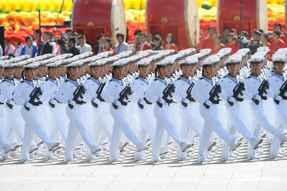 首都各界慶祝中華人民共和國(guó)成立60周年大會(huì)在北京舉行。這是水兵方隊(duì)通過(guò)天安門廣場(chǎng)。中新社發(fā) 廖攀 攝
