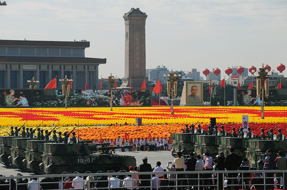 2009年10月1日,中華人民共和國成立60周年慶祝大會在北京天安門廣場舉行。圖為履帶自行榴彈炮方隊(duì)。中新網(wǎng)記者 攝