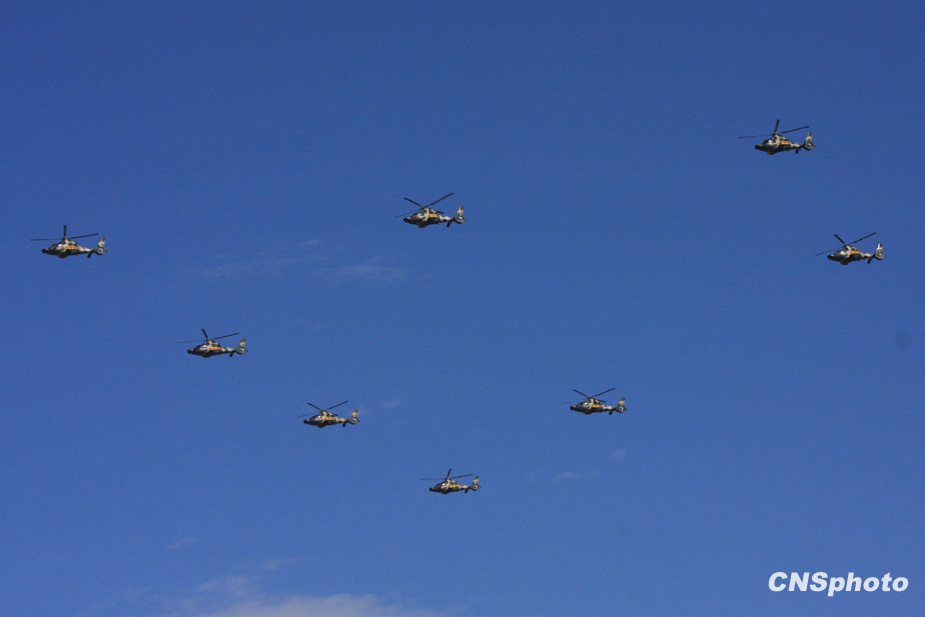 2009年10月1日,中華人民共和國(guó)成立60周年慶祝大會(huì)在北京天安門廣場(chǎng)舉行。偵察直升機(jī)梯隊(duì)。中新社發(fā) 郭國(guó)權(quán) 攝