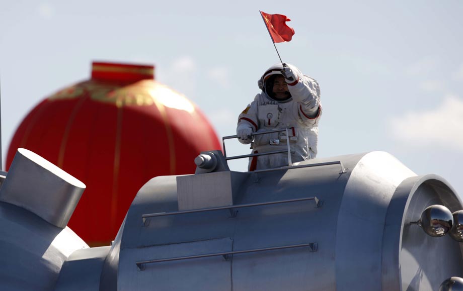 10月1日,中華人民共和國成立60周年慶祝大會(huì)在北京舉行,航天員翟志剛等航天人在群眾游行隊(duì)伍中亮相。 中新社發(fā) 盛佳鵬 攝