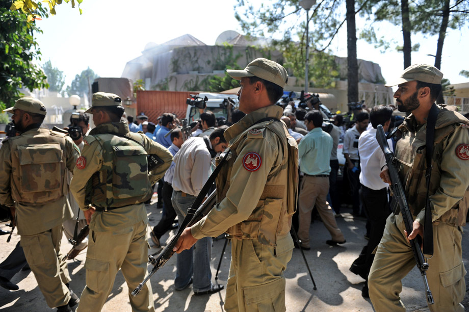 中新網(wǎng)10月5日電 據(jù)法新社報(bào)道,聯(lián)合國(guó)位于巴基斯坦伊斯蘭堡的辦公樓內(nèi)5日發(fā)生自殺式襲擊爆炸,導(dǎo)致3人死亡。報(bào)道稱(chēng),當(dāng)時(shí)有80人在該辦公樓工作,遇害者中包括一名外國(guó)人,另外2人是巴基斯坦婦女。還有6名傷者被送往醫(yī)院。圖為安全人員在發(fā)生爆炸的辦公室附近警戒。