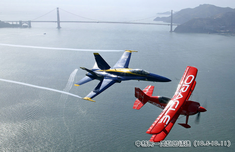 2009年10月8日,美軍飛機(jī)在舊金山灣上空進(jìn)行飛行演練。一年一度的舊金山艦隊(duì)周將于10月10日開(kāi)幕,屆時(shí)會(huì)有船艦游行和飛行表演等活動(dòng)。來(lái)源:中國(guó)新聞網(wǎng)