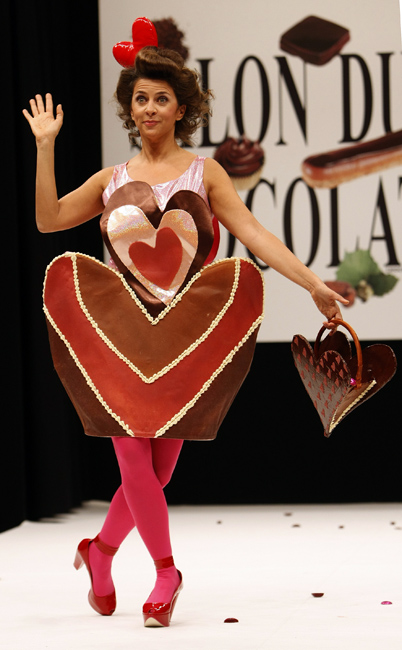 10月13日,第15屆法國(guó)巴黎巧克力展開(kāi)幕,眾多明星身著巧克力服飾亮相。圖片來(lái)源:中國(guó)新聞網(wǎng)
