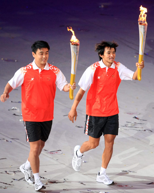 十月十六日晚,中華人民共和國第十一屆運動會在山東濟南奧體中心隆重開幕。王皓、香港運動員黃金寶(右)與眾火炬手一起點燃全運圣火。中新社發(fā) 湯彥俊 攝