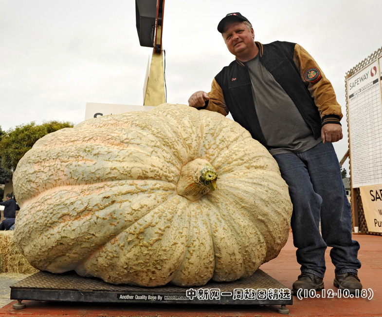 10月12日,美國加利福尼亞州農(nóng)場主Don Young種植的南瓜以1658磅(約752.06公斤)打破世界紀(jì)錄。圖片來源:中國新聞網(wǎng)