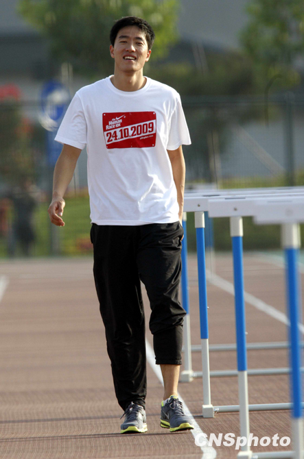 10月22日下午,“飛人”劉翔亮相濟南奧體中心田徑訓練場,場外的志愿者呼喊“劉翔,12秒86”,他笑答“11秒86”。中新社發(fā) 張宇 攝