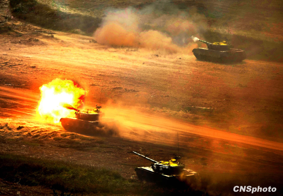 解放軍“前鋒-二00九A”演習(xí),二十二日在濟(jì)南軍區(qū)某合同戰(zhàn)術(shù)訓(xùn)練基地進(jìn)行陸空聯(lián)合火力打擊實(shí)兵實(shí)彈演練。中新社發(fā) 宋吉河 攝