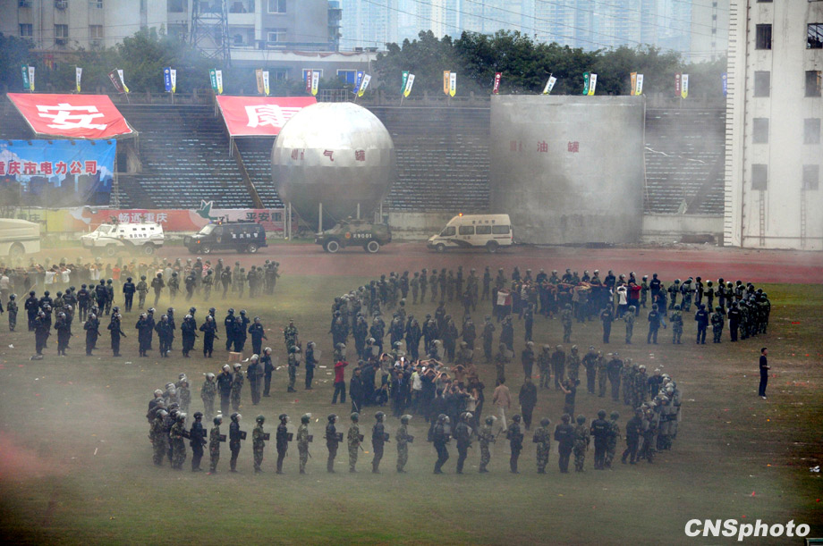 10月23日下午3時40分,推進“平安重慶”建設(shè)突發(fā)事件應(yīng)急演練在該市渝中區(qū)大田灣體育場舉行,重慶各警種突精銳力量重裝登場,將各類事件一一化解。圖為演練處置暴力騷亂事件中,處置隊成“包圍隊形”將“暴徒”控制。中新社發(fā) 曹多然 攝