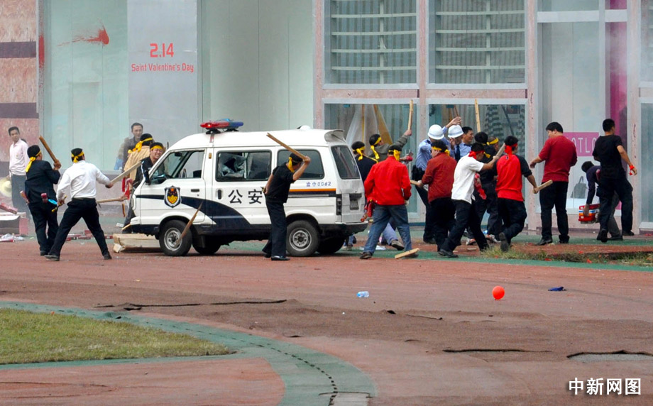 陸續(xù)涌來的“暴徒”,帶來了鐵棍、長刀、鐵鏈等兇器,并結伙圍打執(zhí)勤民警,出現摔、砸商業(yè)設施和投擲礦泉水瓶等行為,在廣場上出現了反動標語,“暴徒”不斷叫囂反動語言,引發(fā)附近眾多群眾圍觀,鬧事人群已達200余人。曹多然 攝
