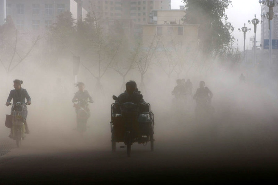周日(18日), 河北石家莊,中華大街與裕華路交口,自行車在大風(fēng)引起的揚塵中艱難前行。10月18日起,北方迎來大幅降溫,部分地區(qū)風(fēng)力將達8級。 阿拉爾 攝