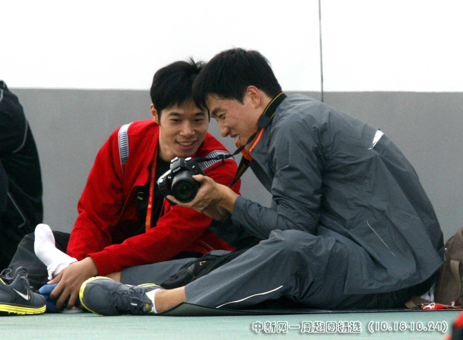 10月22日下午,“飛人”劉翔亮相濟(jì)南奧體中心田徑訓(xùn)練場,訓(xùn)練間隙手拿相機(jī),客串?dāng)z影記者。中新社發(fā) 張宇 攝。>>點(diǎn)擊觀看詳細(xì)內(nèi)容